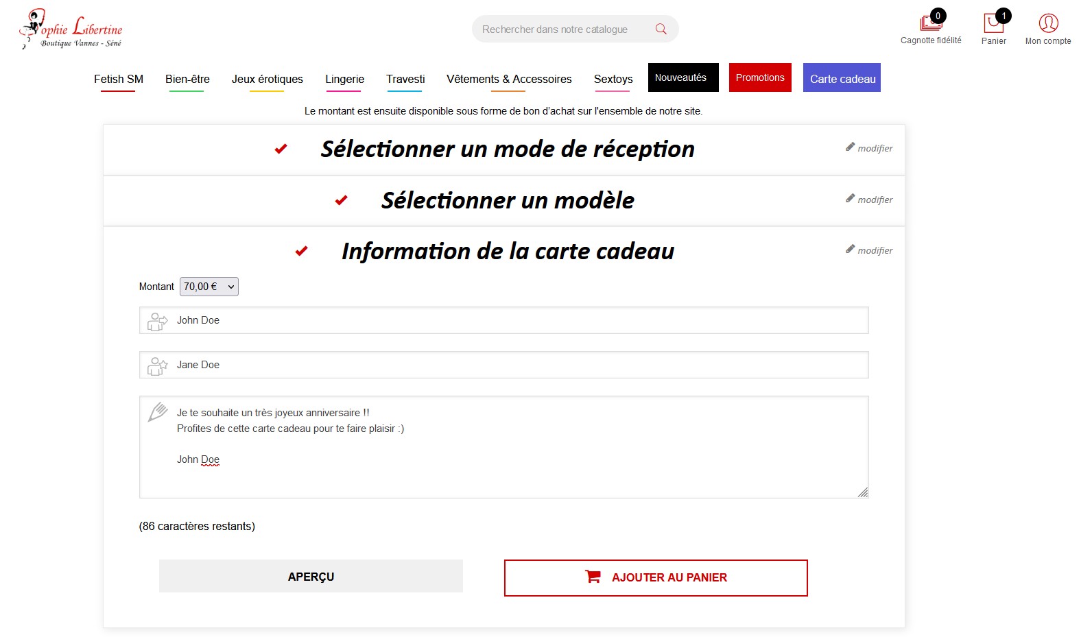 En haut vous choisissez le montant de votre carte cadeau, nous vous proposons divers montant entre 5 et 300€ ( si vous ne trouvez pas votre bonheur dîtes le nous, nous ajouterons le montant de votre choix)Ici c'est John Doe, qui veut offrir un chèque cadeau pour l'anniversaire de sa douce Jane.Vous entrez votre petit mot personnalisé... Seul vous et le/la destinataire pourront lire se message alors faites vous plaisir !!!Une fois que tout vous semble correct, vous cliquez sur AJOUTER AU PANIER.Si vous commandez simplement votre carte cadeau, vous ne payez pas de frais de port puisque celle-ci vous parvient par mail.Si toute fois vous désirez d'autres articles, vous pouvez les ajouter directement dans votre panier et finaliser la totalité de votre commande.